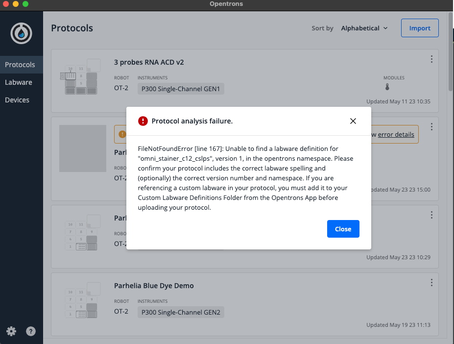 <figure><img src="https://3271682270-files.gitbook.io/~/files/v0/b/gitbook-x-prod.appspot.com/o/spaces%2FWKyUXOqIKtqE7cAUE2yQ%2Fuploads%2FkDa7eHWkWqsVnJaJXUSH%2Fmissing%20labware%20definition%20error%20window.png?alt=media&#x26;token=a0518a48-fdee-4a5d-a86c-c3536ecb06fe" alt=""><figcaption><p>Missing labware definition error details</p></figcaption></figure>