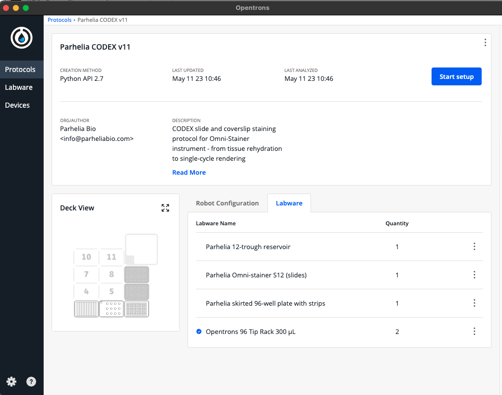 <figure><img src="https://3271682270-files.gitbook.io/~/files/v0/b/gitbook-x-prod.appspot.com/o/spaces%2FWKyUXOqIKtqE7cAUE2yQ%2Fuploads%2FZpYR9YSQxRTPtOlWYStv%2FScreenshot%202023-05-18%20at%202.44.40%20PM.png?alt=media&#x26;token=09fd7bfc-9147-4442-bd41-a1dde957f360" alt=""><figcaption><p>Example of staining protocol loaded into Opentrons</p></figcaption></figure>